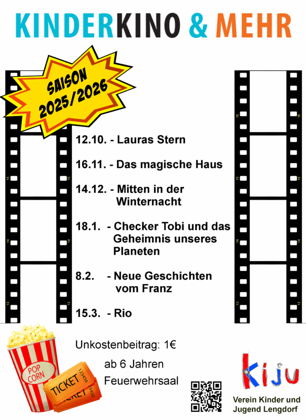 - Kinderkino – Vorschau Saison 2025/26Bald geht’s wieder los beim Kinderkino in Lengdorf. Freut euch auf diese cineastischen Highlights Hier ist für alle etwas dabei.
